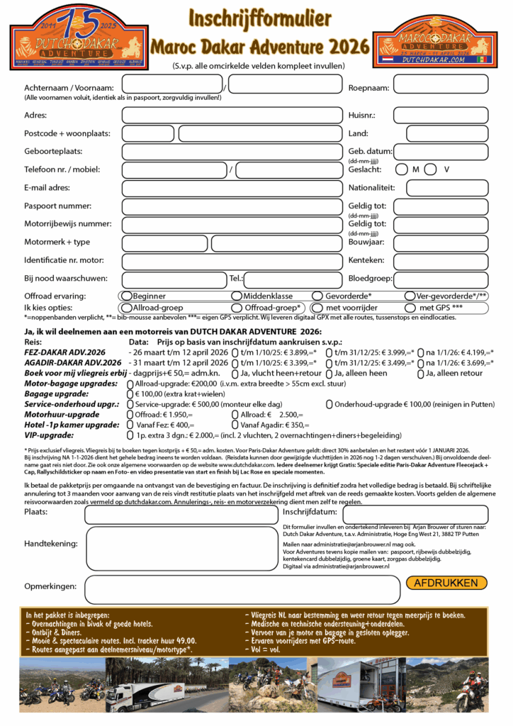 Door de jarenlange ervaring en de internationale contacten van Arjan Brouwer, 8-voudig Dakar-deelnemer kennen we de mooiste routes en tracks. Met alternatieven per dag op diverse niveaus.